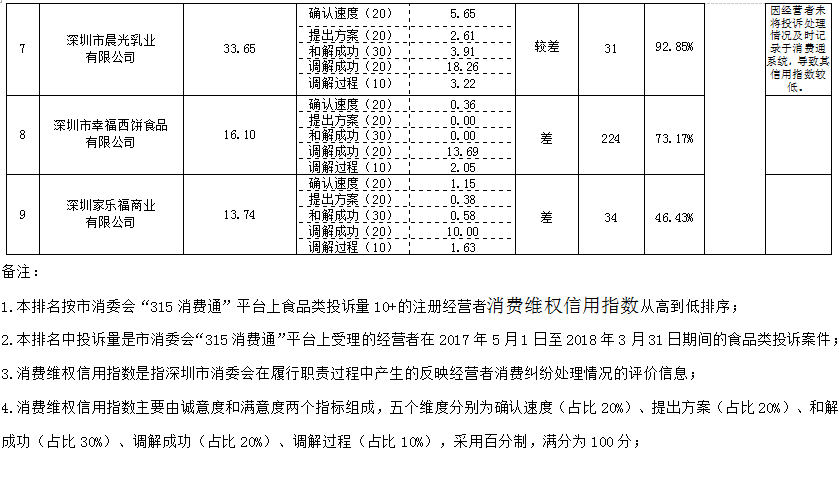 一、深圳市食品行業(yè)消費(fèi)維權(quán)信用指數(shù)排行榜