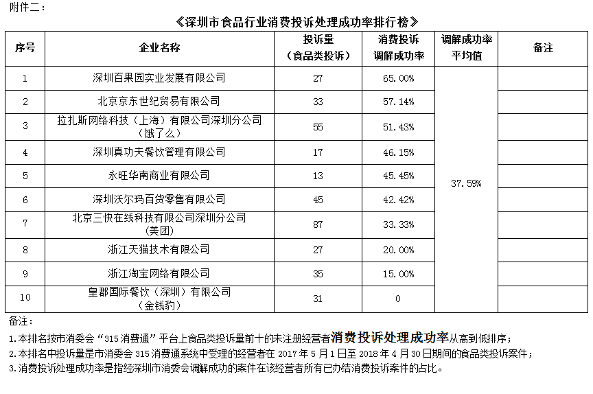 附件二:《深圳市食品行業(yè)企業(yè)消費(fèi)投訴處理成功率排行榜》