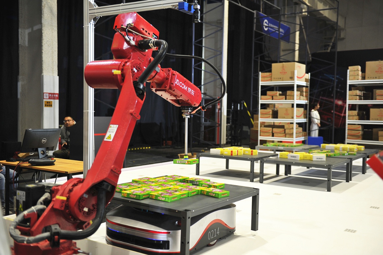 為了展現(xiàn)無人倉的全程智能化流程,本次峰會外展區(qū)設(shè)置了智能動態(tài)展區(qū)。在現(xiàn)場,動態(tài)運行的揀選機械臂、自動打包機與飛馬機器人、智能叉車等一起,共同構(gòu)成了京東無人倉強大的倉儲系統(tǒng)。目前在京東智能化倉儲體系內(nèi),智能機器人設(shè)備已經(jīng)實現(xiàn)了家用電器、美妝個護、電腦辦公、服飾內(nèi)衣、醫(yī)療保健等五大訂單品類的應(yīng)用場景覆蓋,通過地狼、天狼、分揀AGV、交叉帶分揀機、AGV叉車、機械臂等12種自主研發(fā)機器人的投用,大大提升了京東的訂單處理效率。
