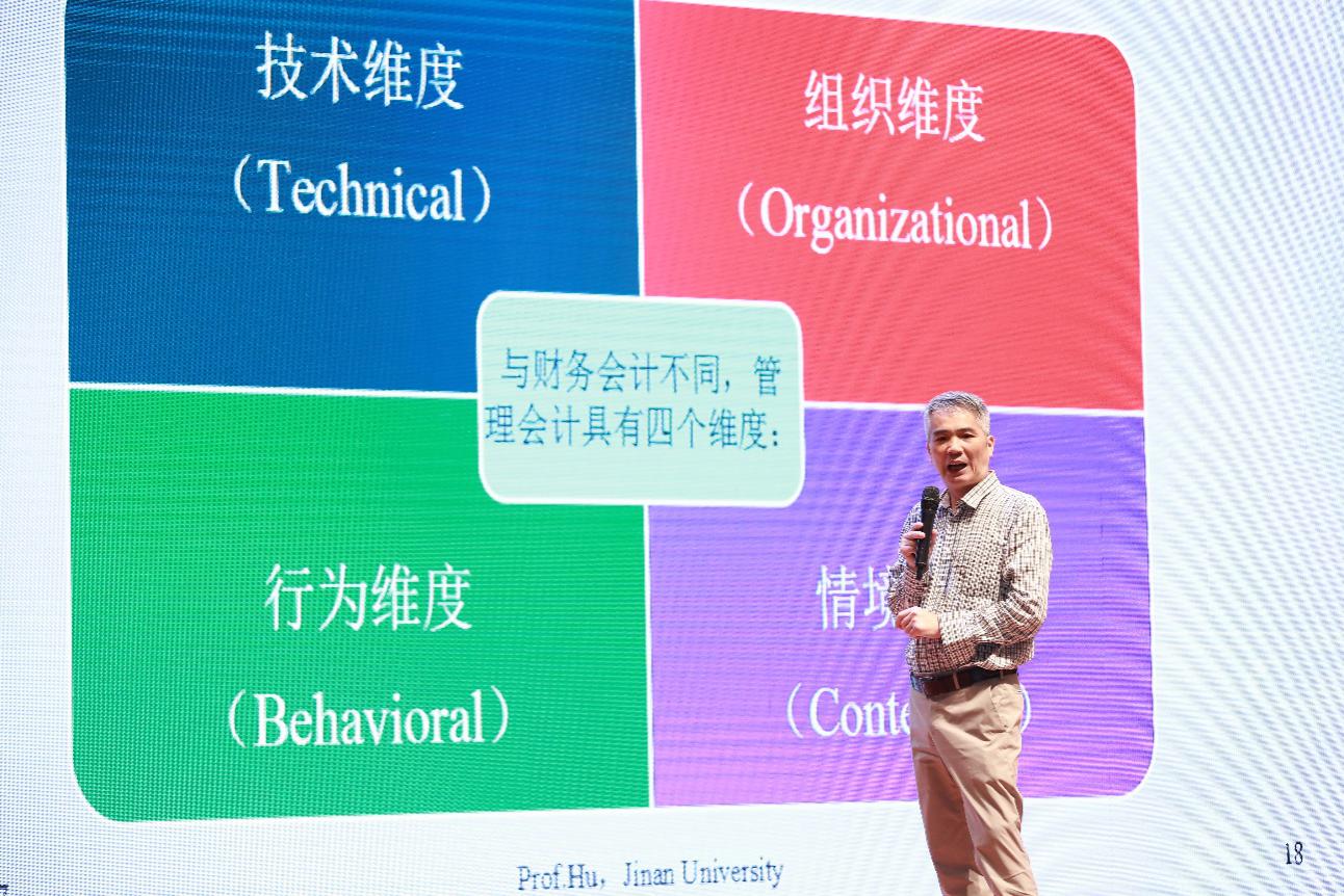 下午,暨南大學(xué)會計系教授胡玉明以“管理會計如何‘由技入道’”為題,首先分析了管理會計與財務(wù)會計有何不同,并深入淺出的剖析了大智移云背景下,管理會計的提升關(guān)鍵在于分析對數(shù)字背后意義。他強調(diào),會計人員對大數(shù)據(jù)等新科技挑戰(zhàn)不應(yīng)當(dāng)恐慌,反而應(yīng)當(dāng)成機遇,提升數(shù)據(jù)分析能力。