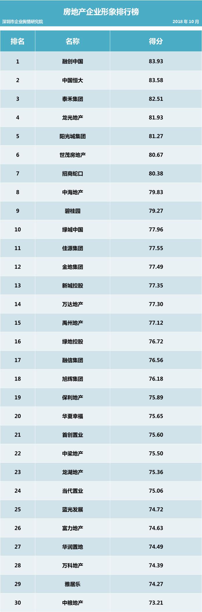 本榜單從規(guī)模實力、輿論曝光度、主動推廣力度、投資者關系和負面影響等五個維度,對2018年10月1日至10月31日這一時段內(nèi)房地產(chǎn)行業(yè)各企業(yè)公眾形象進行綜合評估并排名,旨在對房地產(chǎn)行業(yè)各企業(yè)開展品牌形象塑造、宣傳推廣策略、公共關系維護、品牌影響力等方面的綜合評價,既幫助相關企業(yè)找準合適的品牌定位、發(fā)展方向,也為消費者和投資者提供科學、公正、獨立的消費和投資決策參考。