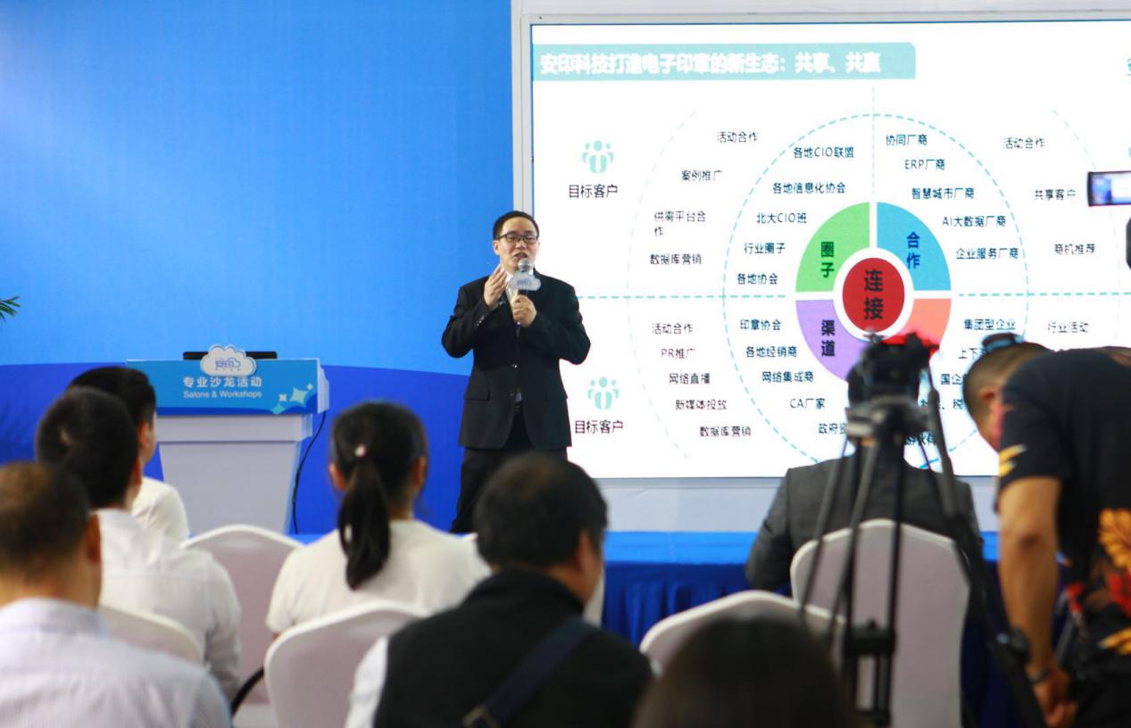 隨后,安印科技營銷副總劉昕發(fā)表了演講,他給大家分享了安印對(duì)電子簽章技術(shù)應(yīng)用前景的思考和探索,并對(duì)安印電子印章生態(tài)圈進(jìn)行全方位的解讀。劉總表示,對(duì)于企業(yè)來說進(jìn)入數(shù)字時(shí)代的深遠(yuǎn)影響與沖擊,絕不僅僅是技術(shù)上的創(chuàng)新與突破,更將是一次理念認(rèn)識(shí)的徹底洗禮。通過由傳統(tǒng)蓋章模式向互聯(lián)網(wǎng)簽章模式的轉(zhuǎn)變,安印電子印章生態(tài)圈能有效地助力企業(yè)運(yùn)營的提質(zhì)、增效、降本,不斷迸發(fā)出改變與前進(jìn)的力量。