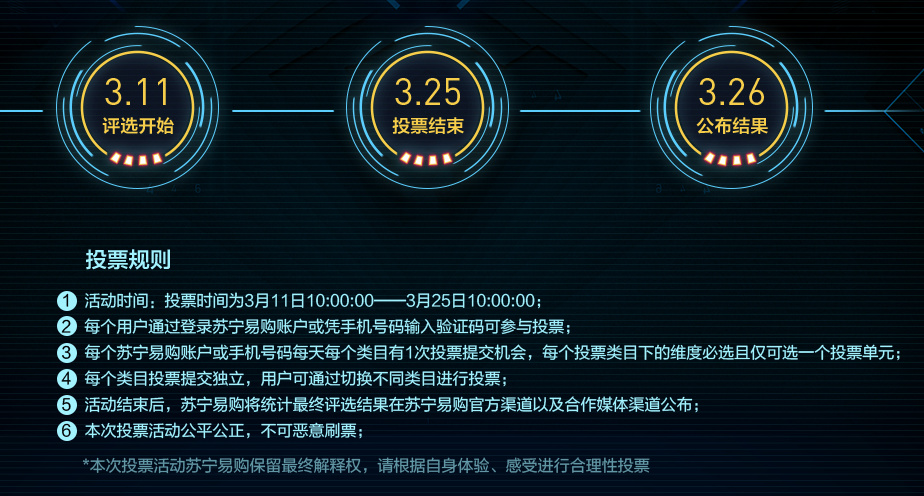 3月11日用戶投票評選開始,3月25日投票結(jié)束,26日正式公布投票結(jié)果,活動(dòng)貫穿蘇寧易購315全民煥新節(jié)期間,面對眾多手機(jī)、電腦、數(shù)碼新品,用戶會(huì)作何選擇?