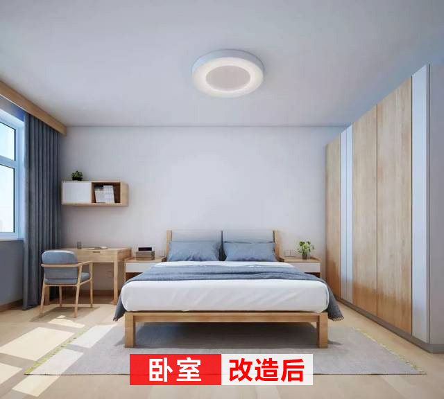 改造后的臥室開闊簡潔,藍灰色床品與窗簾,色調一致,一整排的衣柜完全可以滿足生活需求。