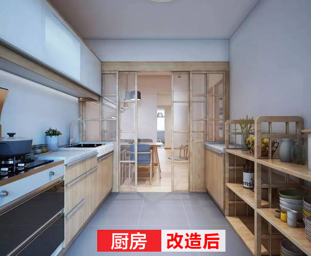 改造后的廚房干凈利索,各個功能區(qū)分明顯,木質的隔板、柜子實用美觀,還利用玻璃移門分隔了廚房與外部。