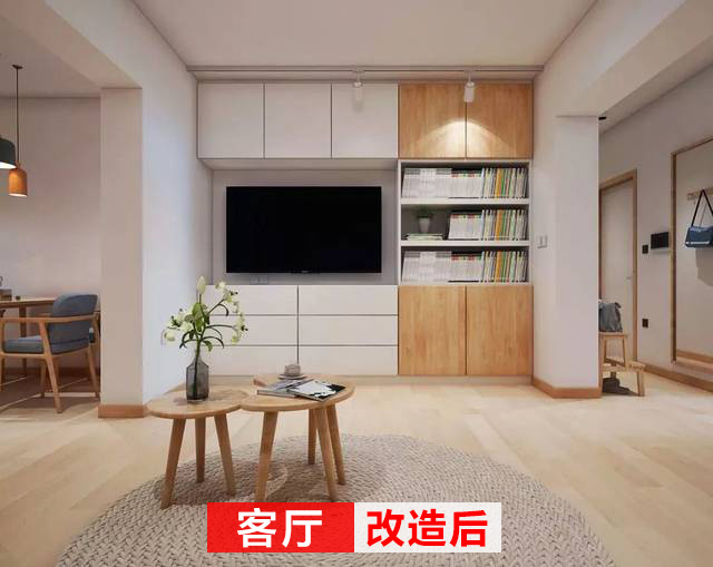 改造后的客廳同樣干凈簡潔,打造一面電視柜做儲物,抽屜+儲物柜+書柜的設計,能夠滿足客廳的收納需求。