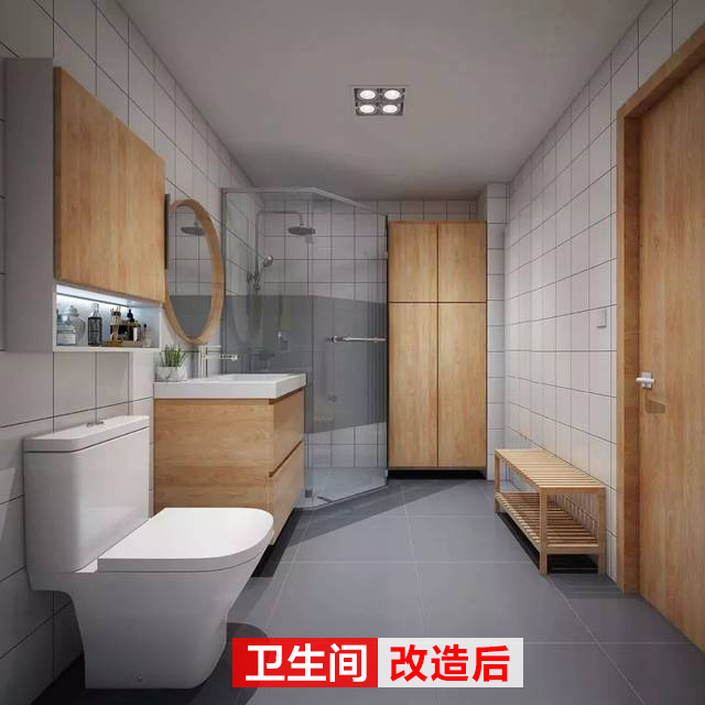 衛(wèi)生間面積還是不小的,在淋浴房旁做了一個儲物柜,放一些清潔物品,拖把等;馬桶上方的收納也利用起來,整個衛(wèi)生間的布局趨于合理。