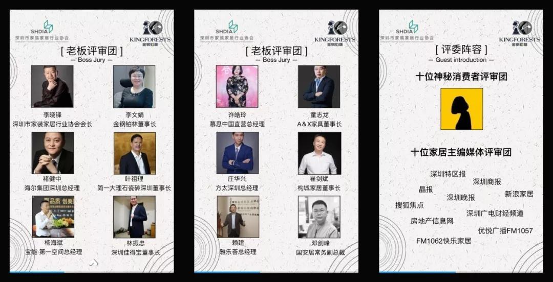 其中,由簡(jiǎn)一大理石瓷磚、海爾卡薩帝、慕思寢具、A&X家具、方太電器、構(gòu)城定制、雅樂薈、寶能第一空間、國安居、佳得寶等家居行業(yè)知名品牌老總組成的老板評(píng)審團(tuán)特別引人注目。組委會(huì)特別介紹,這些品牌在行業(yè)的影響力有目共睹,他們的認(rèn)可是對(duì)設(shè)計(jì)能力與市場(chǎng)影響力不可置疑的肯定。