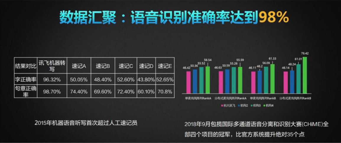 在英文語音識(shí)別、機(jī)器閱讀理解、國際識(shí)別挑戰(zhàn)賽等多個(gè)A.I.領(lǐng)域的國際賽事 中,科大訊飛均名列前茅, 至今已獲得12項(xiàng)世界第一。2018年9月,訊飛再次包攬國際多通道語音分離和識(shí)別大賽(CHiME-5)全部四個(gè)項(xiàng)目的冠軍,該大賽被稱為“史上最難語音識(shí)別任務(wù)”,考察的是在不同場(chǎng)景中自由交談的遠(yuǎn)場(chǎng)語音識(shí)別效果。也再次證實(shí)了訊飛語音識(shí)別在噪音、口音和遠(yuǎn)場(chǎng)識(shí)別挑戰(zhàn)下的絕對(duì)領(lǐng)先優(yōu)勢(shì)。與此同時(shí),訊飛轉(zhuǎn)寫引擎于2005年開始應(yīng)用服務(wù),期間歷經(jīng)數(shù)次迭代升級(jí)。
