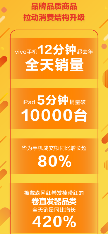 作為傳統(tǒng)優(yōu)勢品類,手機在今年618年中購物節(jié)首日的表現(xiàn)仍舊搶眼。vivo手機12分鐘超去年全天銷量,最終全天的銷量達到去年同期的11倍;華為手機成交額同比增長超80%,華為手機配件成交額同比增長超300%; iPad在5分鐘的銷量就突破萬臺。