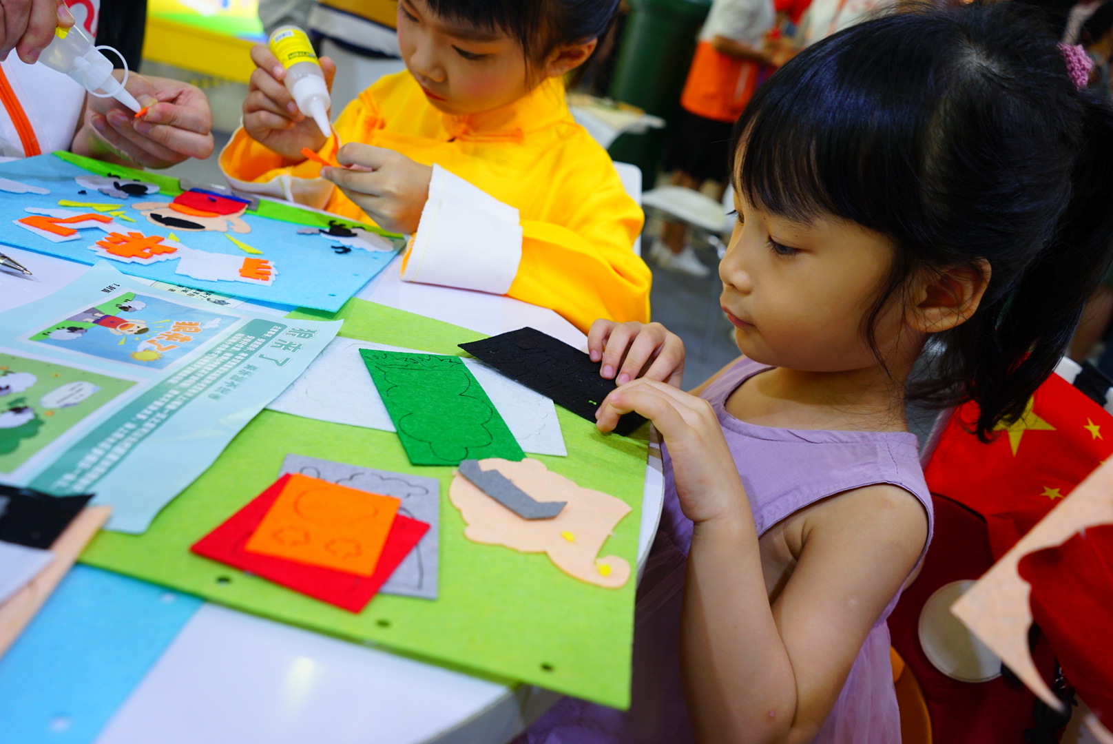 在“手工布書制作”體驗區(qū),志愿者耐心地引領(lǐng)兒童制作專屬自己的一本不織布手工書,感受動手及閱讀帶來的另一種快樂。