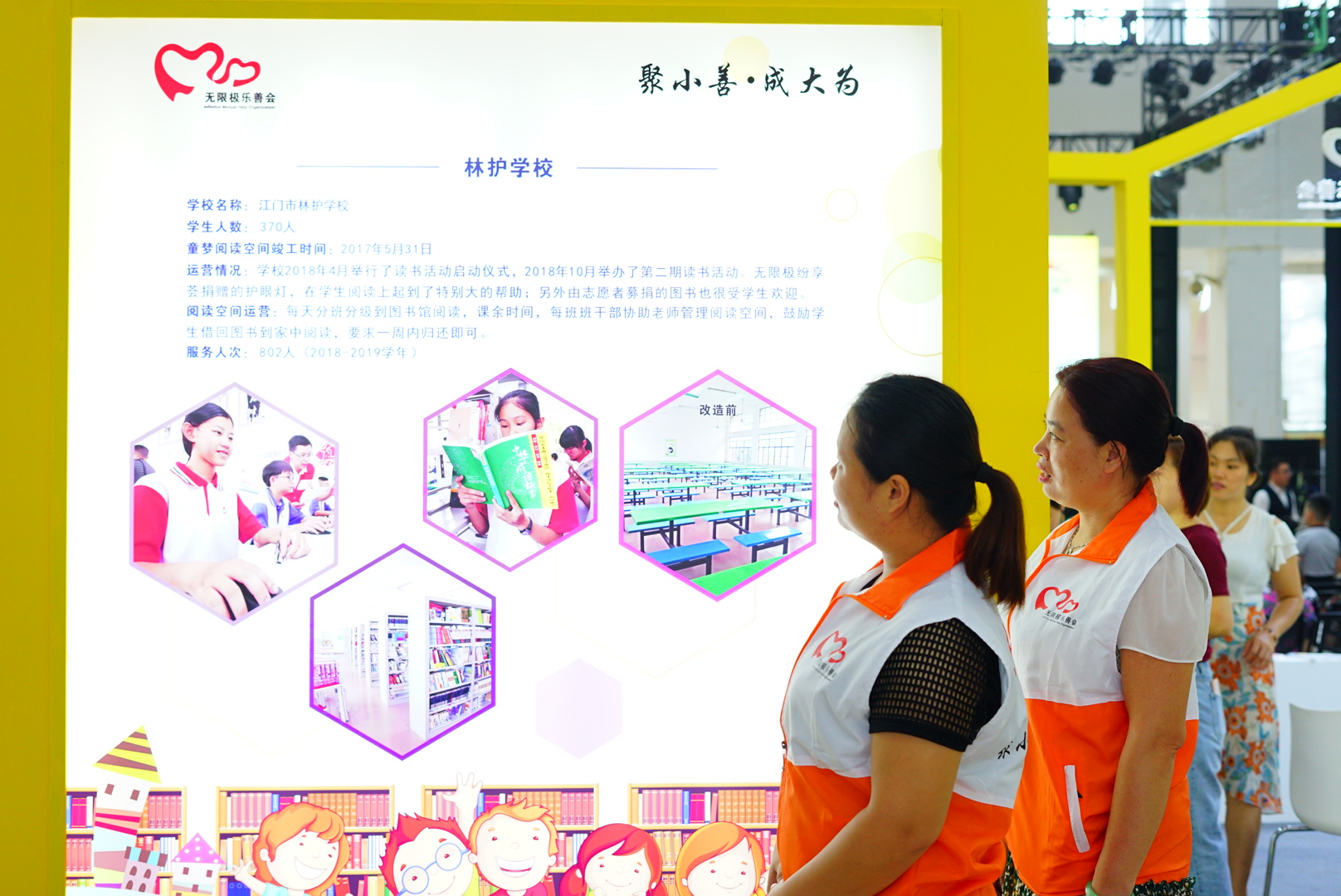 在南國書香節(jié)江門分會場的場館中央,“黃色小屋”尤其吸人眼球。在項目展示上,無限極樂善會多年來一直關(guān)注鄉(xiāng)村兒童的閱讀教育問題,自2015年起,攜手江門市相關(guān)政府部門發(fā)起了童夢閱讀空間公益項目,致力于兒童閱讀空間建設(shè)及校內(nèi)閱讀推廣工作。在展區(qū),可以看到五所童夢閱讀空間的運(yùn)營等基本情況。