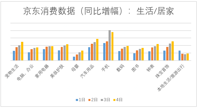 外出旅游如火如荼,“宅”在家中的朋友也不甘寂寞,趁著長(zhǎng)假期間在京東平臺(tái)上為自己、家人或朋友挑選稱心的商品無(wú)疑是最佳的選擇。寵物生活、電腦、母嬰、美妝護(hù)膚、汽車用品、手機(jī)數(shù)碼等商品的銷量在1-4日內(nèi)持續(xù)增長(zhǎng),其中受“京東超級(jí)品牌日”等因素影響,手機(jī)類商品的銷售增長(zhǎng)在3日達(dá)到峰值;有意思的是,一些看似與節(jié)日無(wú)關(guān)的消費(fèi)如圖書、鐘表等相比去年也有較大的漲幅,體現(xiàn)了消費(fèi)者的多元化需求;而國(guó)慶期間的“結(jié)婚潮”則拉高了珠寶首飾的相關(guān)銷售。