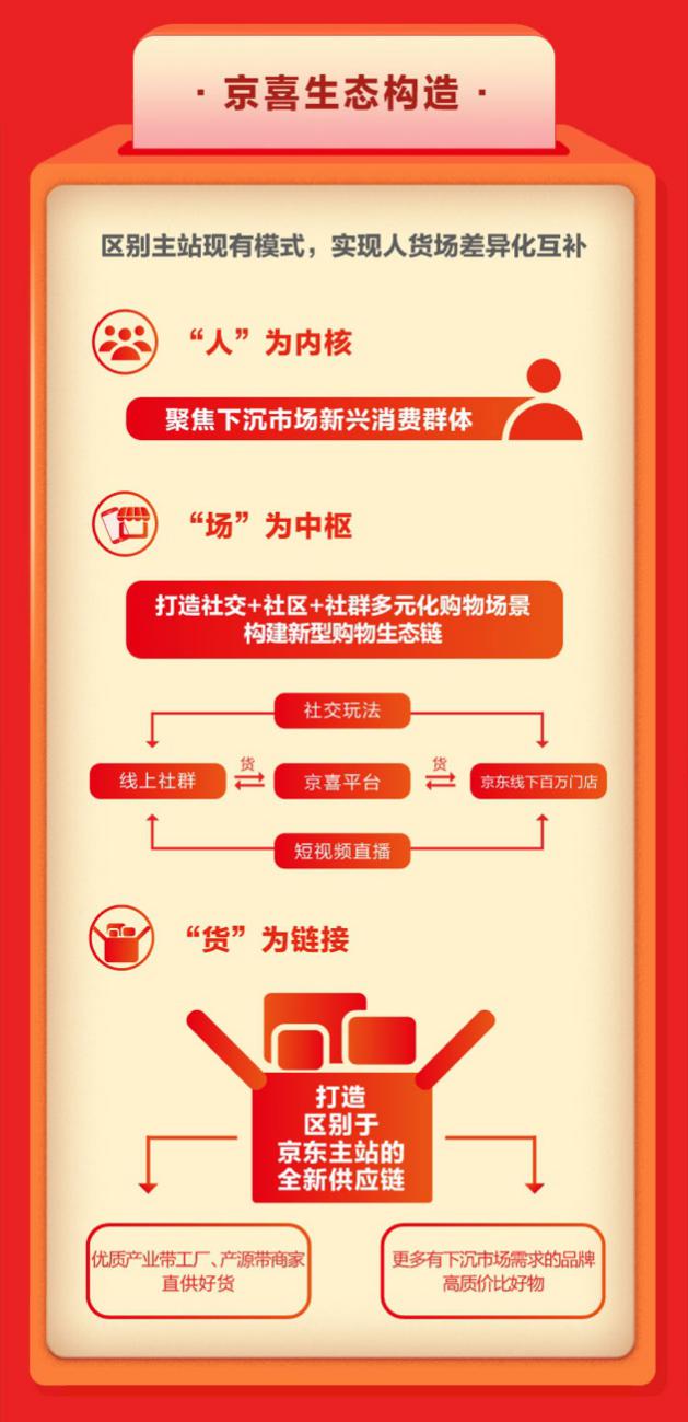 今年,京東打造了區(qū)別于京東主站現(xiàn)有場景和模式的全新平臺——京喜,于9月19日正式上線。京喜聚焦于下沉新興市場消費(fèi)人群,通過高質(zhì)價(jià)比好貨及豐富的社交玩法,與京東主站實(shí)現(xiàn)了“人”、“貨”、“場”的差異化互補(bǔ)。