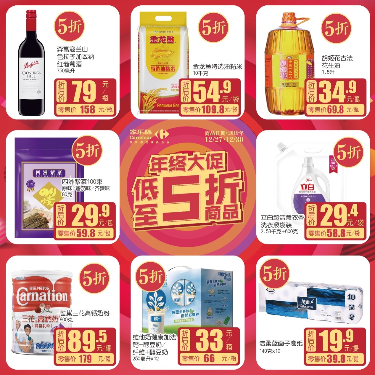 5折雜貨篇:爆款奔富寇蘭山色拉子加本納紅葡萄酒、金龍魚(yú)特選油粘米、胡姬花古法花生油、四洲紫菜、雀巢三花高鈣奶粉、立白超潔薰衣香洗衣液、潔柔藍(lán)面子卷紙……民生致愛(ài)家樂(lè)福全知道,滿(mǎn)足您方方面面的需求!