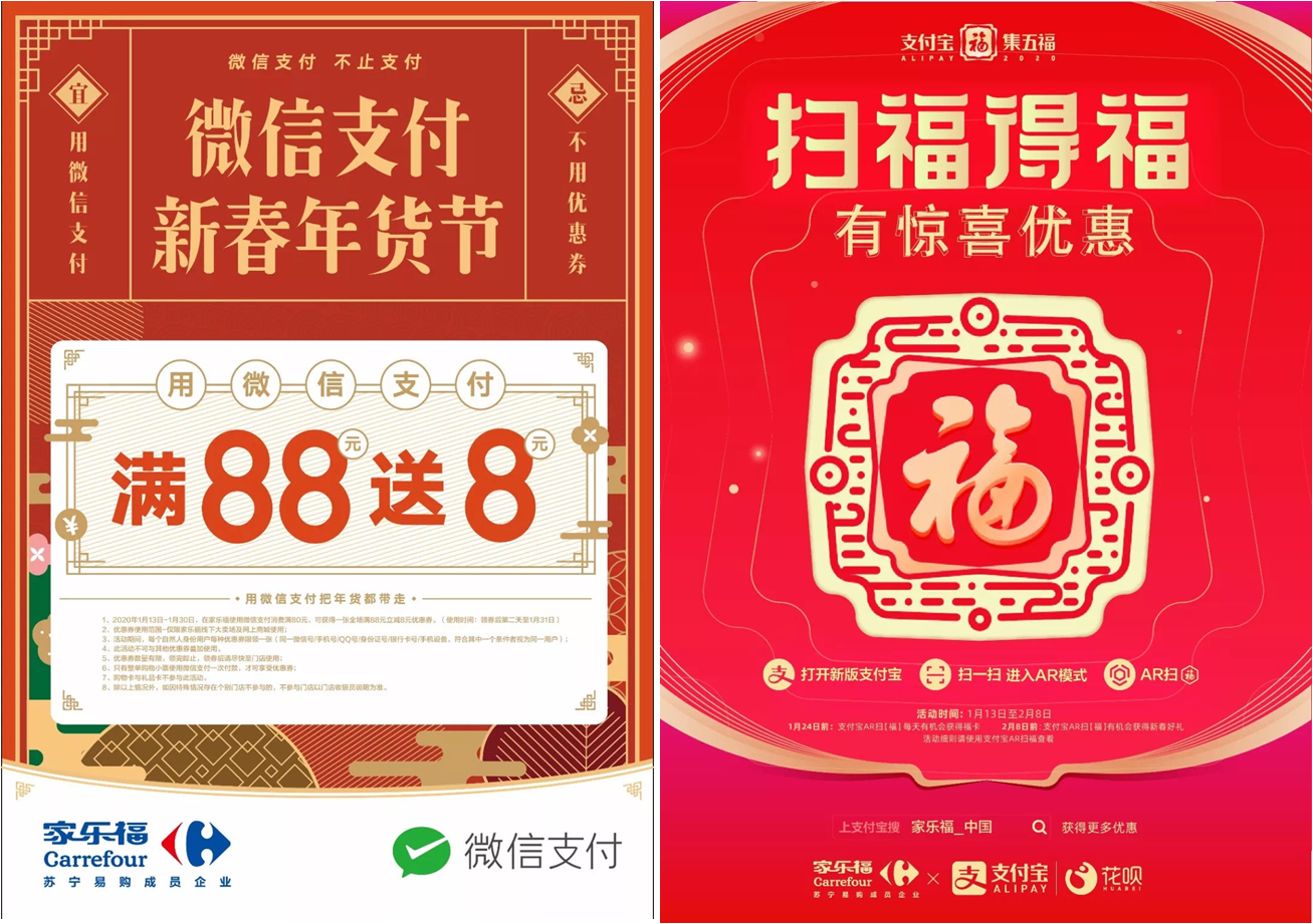 除此之外,各大支付平臺優(yōu)惠券亦開始發(fā)放,助力您的年貨采買。前方高能預警!1月13日至2月8日,顧客使用支付寶掃上圖“福”字以及參與集五?;顒?,即有機會獲得家樂福全場滿200減10優(yōu)惠券。1月13日至1月30日,在家樂福使用微信支付消費滿80元,可獲得一張全場滿88元立減8元優(yōu)惠券,