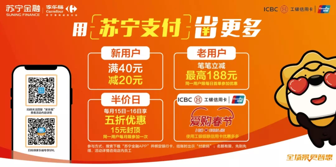 注意啦!使用蘇寧支付省更多!下載“蘇寧金融APP”并綁定銀行卡,在家樂福門店結賬時出示“付款碼”,新用戶可享滿40元減20元,老用戶筆筆立減,最高188元。每月15日至16日半價日,蘇寧支付用戶還可享五折優(yōu)惠,15元封頂。名額有限,先到先得。