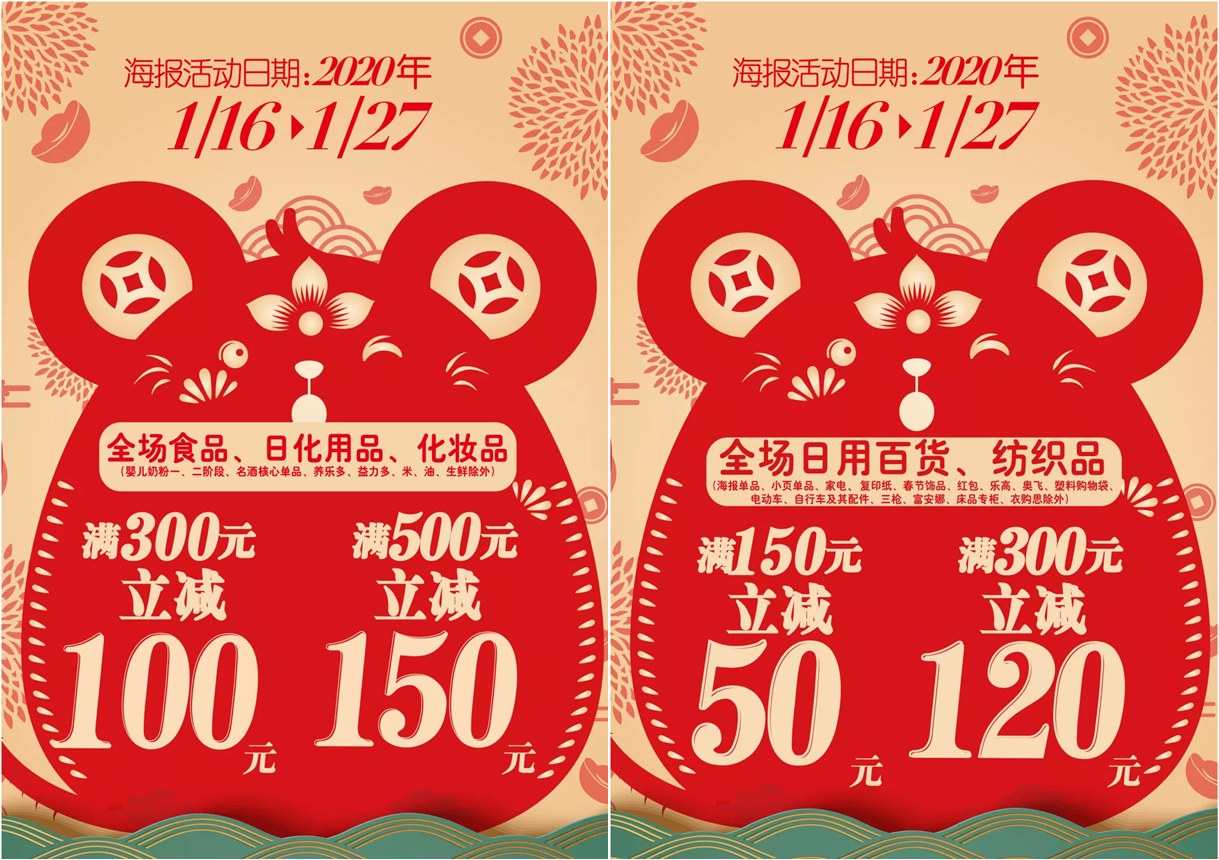 1月16日至1月27日,家樂福華南區(qū)全場食品、日化用品、化妝品滿300元立減100元,滿500元立減150元;全場日用百貨、紡織品(除家電)滿150元立減50元。細則請見家樂福店內信息板或洽詢工作人員。