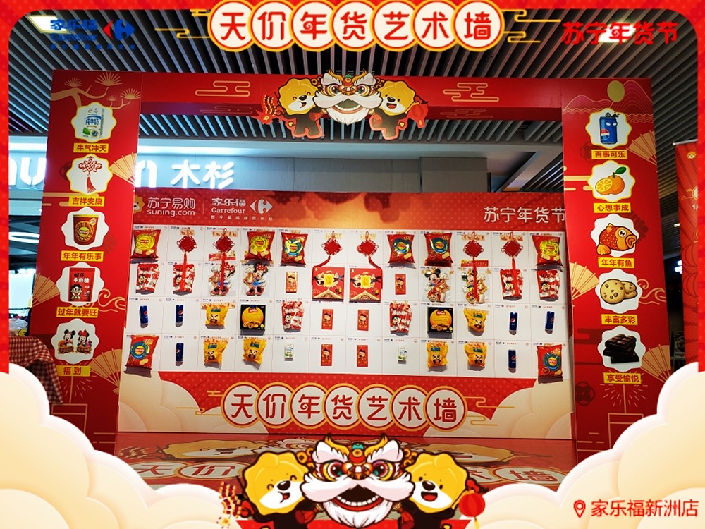 天價年貨藝術(shù)墻,藝術(shù)年貨送不停 ! 1月17日 至 1月 19 日 , 家樂福華南區(qū)廣州員村店、珠海吉大店、福州寶龍店 、廈門中華城店及 深圳新洲店 (活動時間為1.16-1.18) 活動繼續(xù) 。 禮品數(shù)量有限,每天送完即止 !蘇寧家樂福 實力助你過年味滿滿的春節(jié) ,邀請您 來把年貨驚喜領(lǐng)回家 !