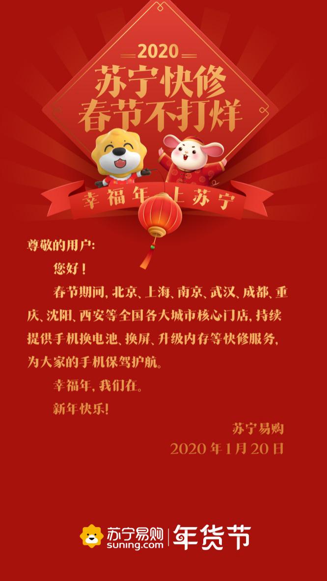 深圳新聞網(wǎng)2020年1月21日訊 春節(jié)臨近,忙著打烊成為了商家常態(tài)。有意思的是,1月20日,蘇寧連發(fā)9條通知,廣而告之“不打烊”。通知顯示,物流、蘇寧幫客、蘇寧快修、以舊換新等服務內(nèi)容,電器店、家樂福、零售云、紅孩子門店、極物等線下業(yè)態(tài)都確保不打烊、不漲價。