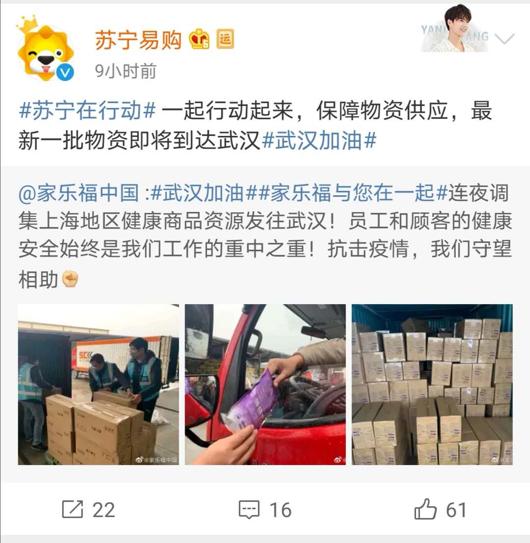 在疫情后方,不少后勤保障單位、組織也是做好了充足的準(zhǔn)備。1月23日,蘇寧旗下家樂(lè)福中國(guó)官方微博發(fā)布了一條關(guān)于 #家樂(lè)福堅(jiān)決不漲價(jià),虧錢也不能漲!#的微博表示,家樂(lè)福中國(guó)管理團(tuán)隊(duì)承諾春節(jié)期間民生用品不漲價(jià),同時(shí)針對(duì)武漢及全國(guó)范圍都提前備好充足貨量,誓與全國(guó)人民一起共渡難關(guān)。