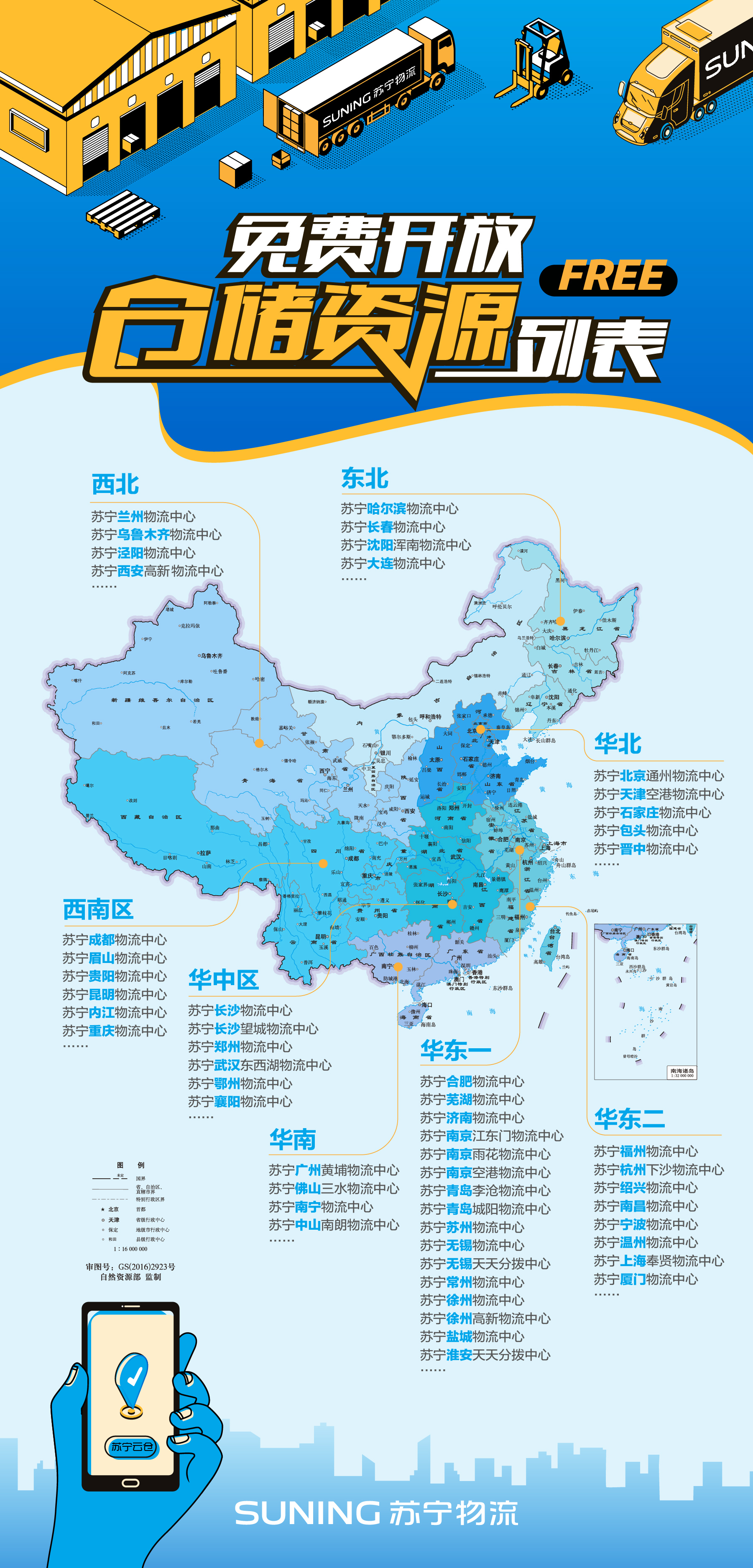 本次免費(fèi)倉(cāng)儲(chǔ)資源涉及蘇寧物流全國(guó)100+物流中心,涵蓋北京、上海、廣州、南京、成都、武漢、沈陽、西安、天津、溫州、長(zhǎng)沙、中山、佛山、徐州、青島、哈爾濱等城市,可滿足全國(guó)絕大多數(shù)地區(qū)的相關(guān)需求。