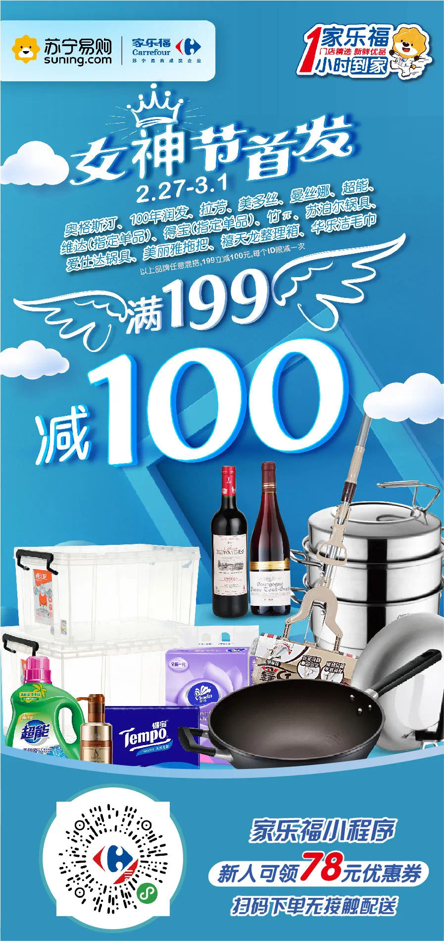 2月27日至3月1日,在家樂福小程序購買奧格斯汀、100年潤發(fā)、拉芳、美多絲、曼絲娜、超能、維達(指定單品)、得寶(指定單品)、蘇泊爾鍋具、愛仕達鍋具、美麗雅拖把等非食品類指定品牌滿199立減100元。