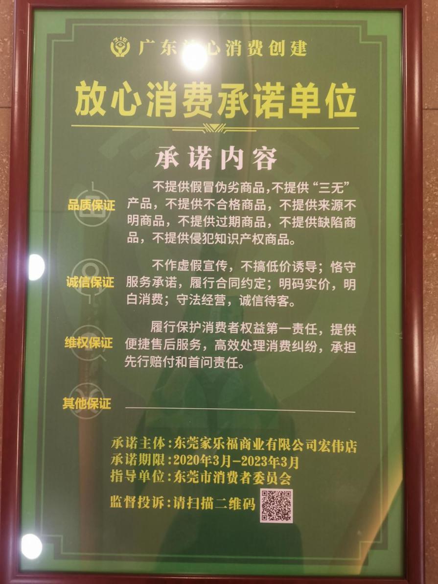家樂(lè)福根據(jù)《經(jīng)營(yíng)者“放心消費(fèi)承諾”活動(dòng)規(guī)則(試行)》向社會(huì)公開(kāi)作出品質(zhì)保證、誠(chéng)信保證和維權(quán)保證的“三大承諾”,承諾不提供假冒偽劣商品,不提供“三無(wú)”產(chǎn)品;不作虛假宣傳;履行保護(hù)消費(fèi)者權(quán)益第一責(zé)任等,充分發(fā)揮放心消費(fèi)承諾單位示范作用,深入推進(jìn)放心消費(fèi)創(chuàng)建活動(dòng),深化消費(fèi)維權(quán)社會(huì)協(xié)同共治,營(yíng)造安全放心的消費(fèi)環(huán)境。