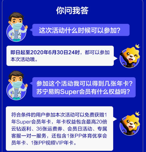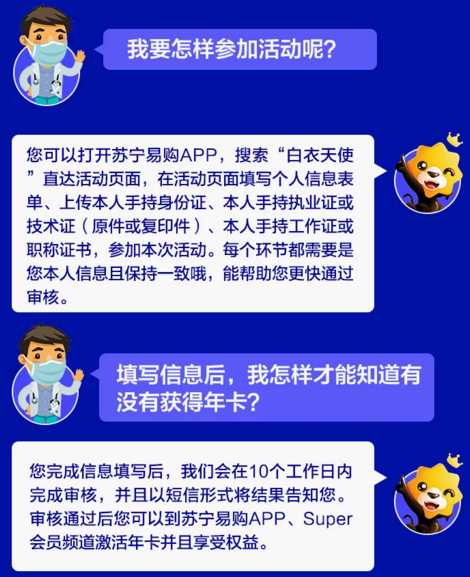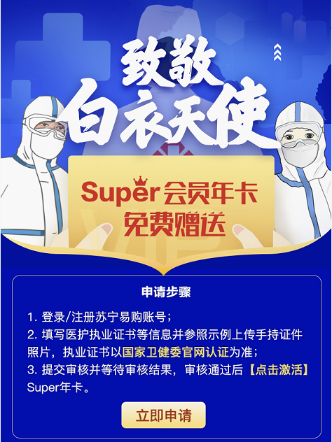 為表達(dá)對(duì)醫(yī)護(hù)工作者的敬意,蘇寧對(duì)全國(guó)醫(yī)護(hù)人員開(kāi)放SUPER會(huì)員免費(fèi)申領(lǐng)活動(dòng)。