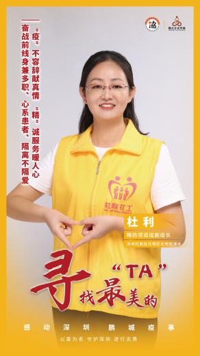 深圳社聯(lián)派駐光明區(qū)光明街道精防社工杜利,在一線戰(zhàn)疫中身兼多職、心系患者、隔離不隔愛。她不僅在深圳新冠肺炎確診數(shù)直線上升的敏感期,挺身而出主動(dòng)為康復(fù)者親赴醫(yī)院領(lǐng)藥并送“愛”上門;白天更是積極開展社區(qū)巡查,幫助服務(wù)對(duì)象積極面對(duì)疫情;晚上再與防疫人員輪班值守、外出巡防,督促商戶們做好防護(hù)工作。