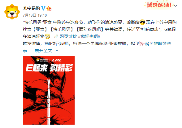 另據(jù)蘇寧官方消息,7月11日~7月18日蘇寧冰爽節(jié)期間,除每千減百、百億補(bǔ)貼,蘇寧冰爽節(jié)亞索主題會(huì)場(chǎng)還為英雄聯(lián)盟玩家粉絲帶來了亞索新皮膚“靈魂蓮華”、風(fēng)扇等好物組成的“快樂大禮包”,用戶可通過下單購(gòu)物、微博互動(dòng)等方式獲取。