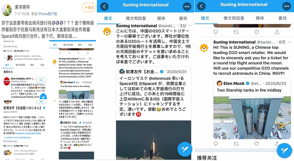 一個馬斯克,一個前澤友作,這趟萬眾矚目的繞月之旅原本跟我們國內(nèi)是沒什么關系的,但因為蘇寧的出現(xiàn)突然有了轉(zhuǎn)機。有微博用戶爆料,蘇寧7月中時候就在推特向馬斯克及前澤友作分別拋出合作求繞月旅行船票的橄欖枝。