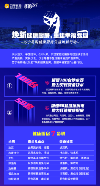 與此同時(shí),洪水致使大批廚房電器受損,疊加高溫天氣,災(zāi)民飲食安全面臨考驗(yàn)。蘇寧易購特別捐贈(zèng)50套健康廚電,涵蓋油煙機(jī)、灶具、消毒柜等必備廚房電器,讓災(zāi)民更快恢復(fù)健康生活。同時(shí),廚房作為“病從口入”最關(guān)鍵的環(huán)節(jié),洗菜、水質(zhì)凈化、烹飪除油煙、餐具清潔消毒、廚余垃圾處理等每一環(huán)都不容忽視,蘇寧易購特別倡導(dǎo)“健康廚房7步驟”,全流程打造健康廚房,并借助蘇寧易購雙線渠道全面開展科普活動(dòng)。