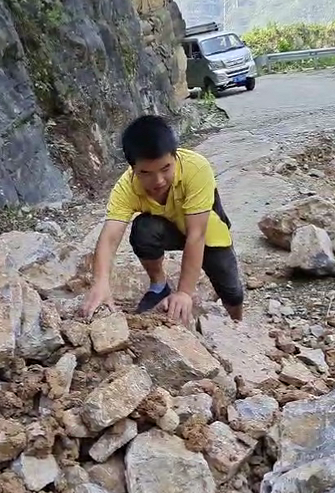 由于前期暴雨天氣,焦厚松車才開到半路,就看到前方的路有了滑坡,緊靠著崖壁的道路已經(jīng)垮了一半?!暗纛^還是前行?”焦厚松最終戰(zhàn)勝了猶豫,“答應(yīng)了用戶今天送到,不能就這樣放棄,先看看情況?!彼_始下車觀察路況,發(fā)現(xiàn)主要是碎石堵住了前方七八米的路程?!叭绻謇硪恍?,車輛就能開過(guò)去?!闭f(shuō)干就干,焦師傅隨后就開始徒手清理路上的石塊。