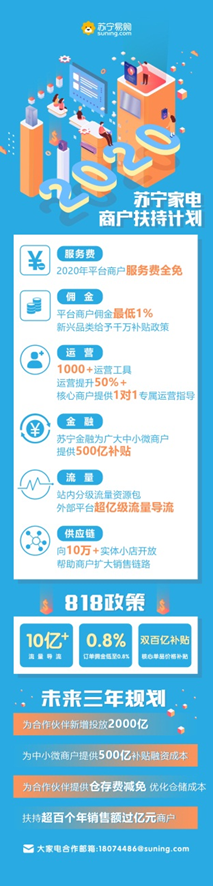 蘇寧宣布,2020年蘇寧將免收平臺(tái)商戶服務(wù)費(fèi);平臺(tái)上的商品供應(yīng)鏈會(huì)向蘇寧生態(tài)中10萬+實(shí)體小店開放,幫助商戶擴(kuò)大銷售通路。同時(shí),大家電行業(yè)線將持續(xù)給平臺(tái)商戶匹配站內(nèi)外的億級(jí)流量,并通過星河生態(tài)賦能平臺(tái)開放1000+運(yùn)營(yíng)工具,針對(duì)核心商戶提供1對(duì)1專屬運(yùn)營(yíng)指導(dǎo),借此幫助商戶有效提升經(jīng)營(yíng)效率,降低運(yùn)營(yíng)成本。818期間,平臺(tái)訂單傭金從最低1%降至0.8%,針對(duì)核心單品提供雙百億補(bǔ)貼,且向平臺(tái)商戶給予10億+的流量導(dǎo)流扶持,幫助商戶全面應(yīng)戰(zhàn)818。
