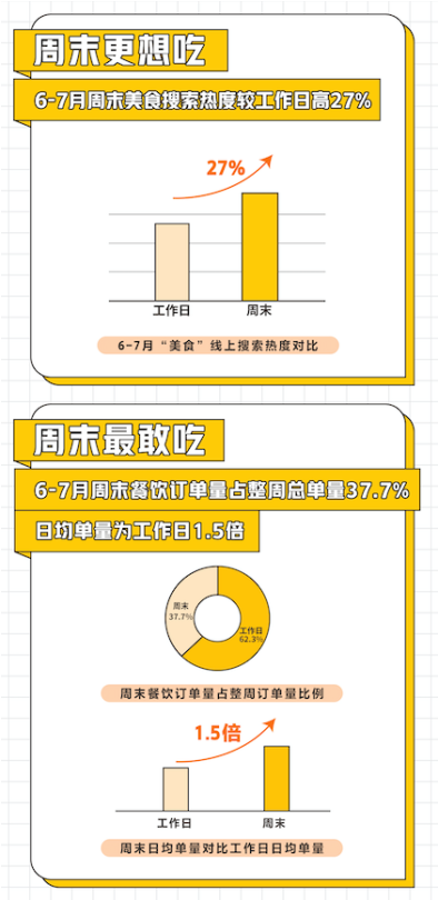 據(jù)美團點評餐飲學院發(fā)布的《2020周末餐飲堂食消費趨勢洞察》顯示,疫情恢復期,餐飲堂食消費活力回歸,周末餐飲消費對整個餐飲市場復蘇助力明顯。美團6-7月線上美食搜索熱度中,周末的搜索熱度較工作日高出27%;周末餐飲線上訂單量占整周總單量的37.7%,日均單量為工作日的1.5倍。周末餐飲消費拉動經(jīng)濟復蘇,正在成為驅(qū)動消費的新引擎。