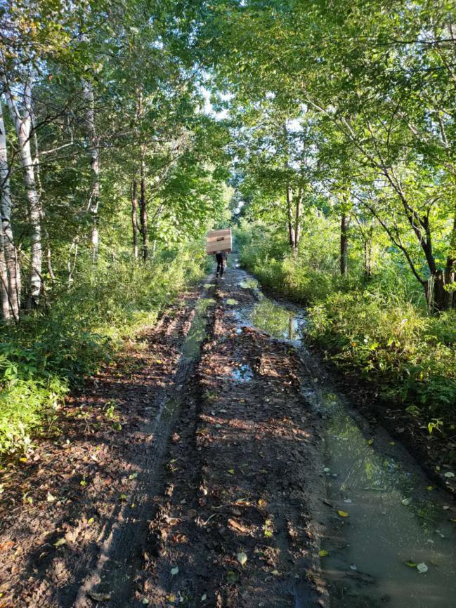 一路開下來,車身濺起不少泥垢??斓侥康牡貢r(shí),一段泥濘的林間小路攔住了王能的去路。原來,道路積水過多,泥土過軟,車輛不能前行。王能隨即將車??吭诼愤?,直接卷上褲腿,扛起電視前行。兩公里的林間路,本就不輕松,扛著電視更是“難上加難”。