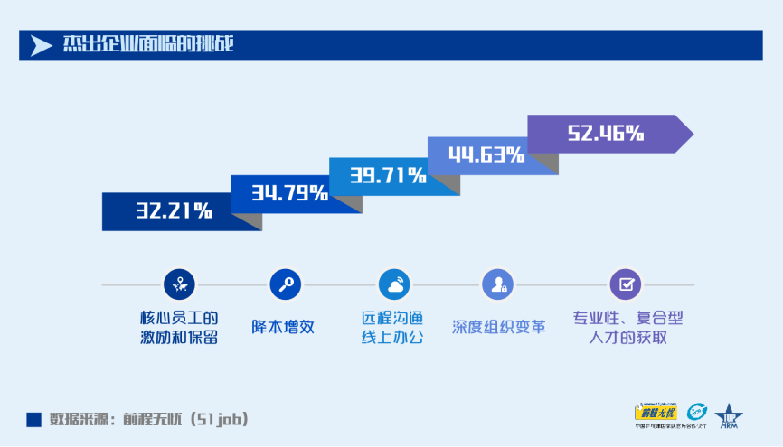 2020年杰出企業(yè)招聘員工總數(shù)較2019年增長了4.21%;55.48%的企業(yè)預(yù)計人均招聘成本呈增長趨勢,在此前提下,依然有56.04%的企業(yè)預(yù)計會在2021年擴大招聘來獲取人才優(yōu)勢。894家獲獎企業(yè)中,有469家將“為籌備未來招募新團隊,加大專業(yè)性人才和復(fù)合型人才的獲取“列為本年度企業(yè)人力資源管理所面臨的最大的挑戰(zhàn)。