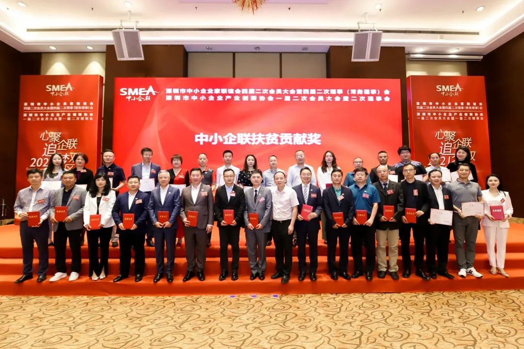 深圳市中小企業(yè)服務局副局長陳小林(左九)為獲得扶貧貢獻獎的企業(yè)家頒獎