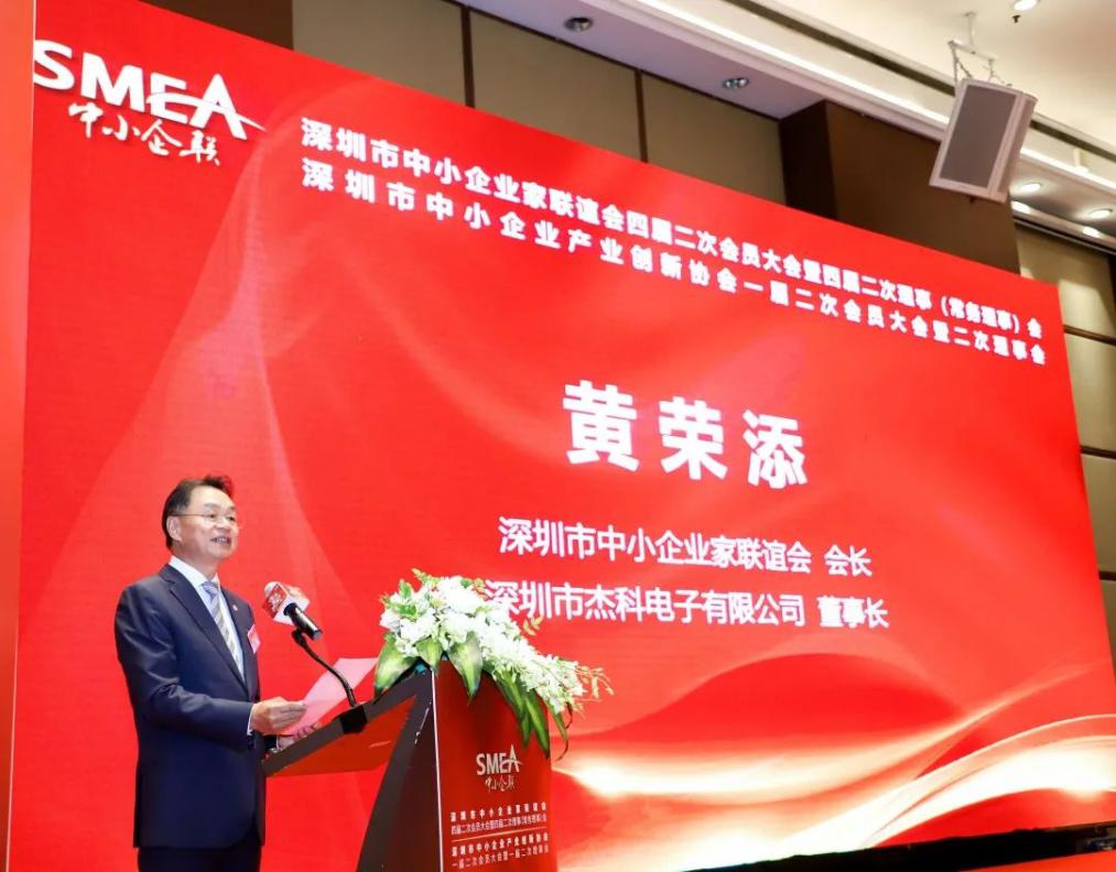 深圳市中小企業(yè)家聯(lián)誼會會長、深圳市杰科電子有限公司董事長黃榮添在致辭中首先對長期以來給予協(xié)會支持的各級領導、會員們表示衷心的感謝。深圳市中小企業(yè)家聯(lián)誼會自2010年9月20日成立以來,在市各級領導的指導和關(guān)懷下,已走過十年的歲月。深圳中小企聯(lián)感恩領導們的幫助與指導,也感恩全體會員的信任與支持!黃會長表示:深圳中小企聯(lián)要緊跟時代步伐,認清當前形勢與任務并對協(xié)會工作提出以下幾方面要求:第一、找準定位,正確履行協(xié)會職能。第二、充分發(fā)揮政企溝通的橋梁紐帶作用。第三、加強內(nèi)外資源有效聯(lián)接,擴大中小企聯(lián)平臺影響力。