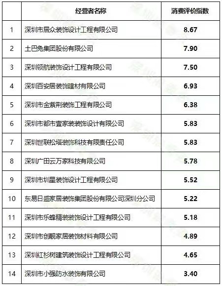 深圳市消委會數(shù)據(jù)顯示,在對2020年4月1日至2021年3月31日期間深圳注冊并有一定市場占有率的14家裝飾裝修經(jīng)營者進行消費評價指數(shù)排名后發(fā)現(xiàn),14家經(jīng)營者均已建立投訴處理和解通道,消費評價指數(shù)平均值為5.98分,大部分企業(yè)能快速響應(yīng)消費者投訴且處理成功率較高,體現(xiàn)了經(jīng)營者對消費者的重視程度較高,降低了消費者的維權(quán)成本。
