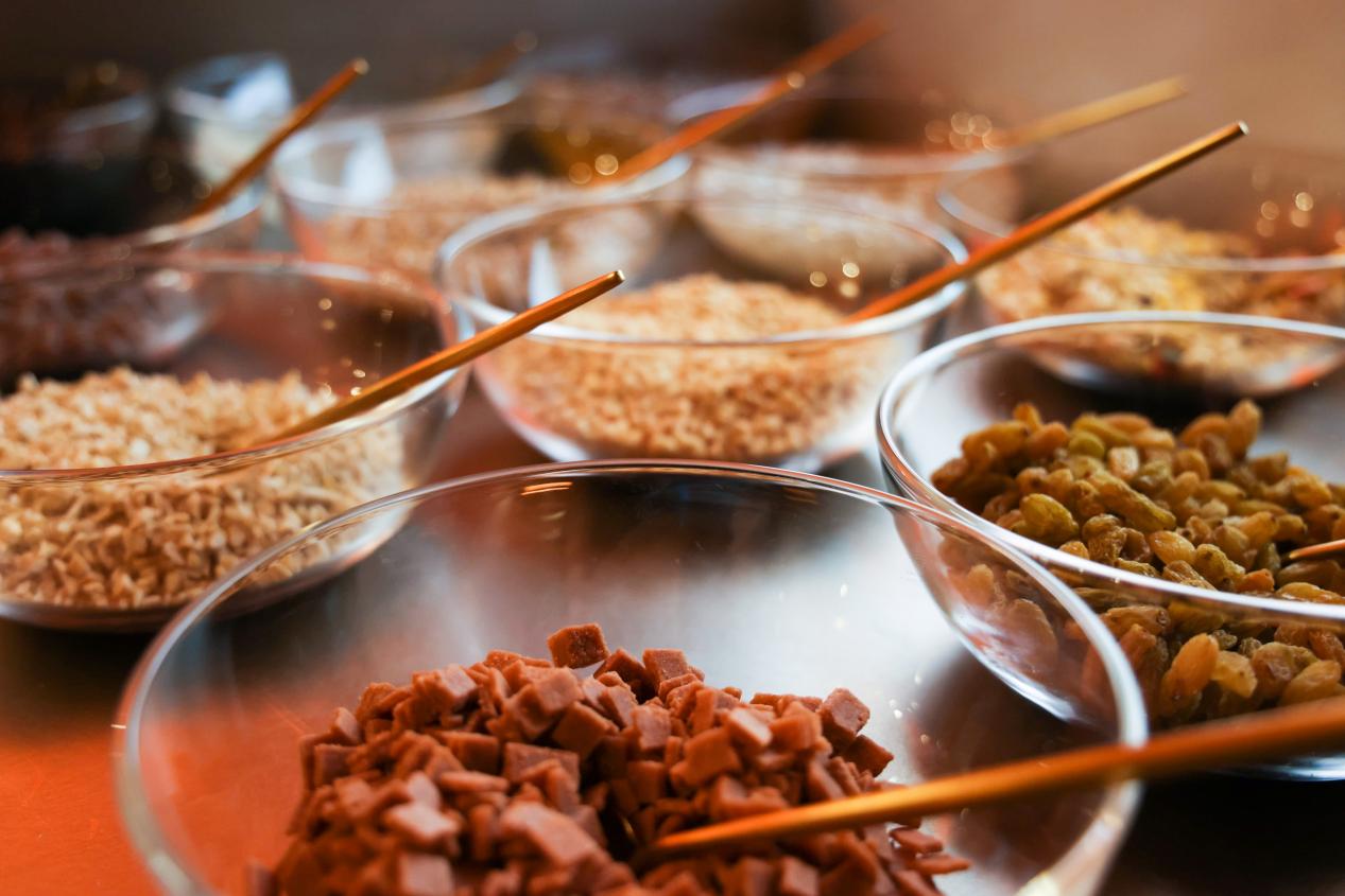 除了產(chǎn)品口味、形式上的革新,探魚的lab店還新增了“DIY”專區(qū)。茶水、水果、涼菜、冰粉都可以在DIY區(qū)根據(jù)自己的口味隨意搭配,增加了消費(fèi)者在用餐過(guò)程中的可玩性。值得一提的是,探魚的DIY冰粉取消了目前市場(chǎng)中常見(jiàn)的或固定或多樣的搭配方式,為消費(fèi)者提供了3種冰粉基底,18種各色配料,搭配方式和用量全部由消費(fèi)者自己選擇。不同口味質(zhì)地的配料為消費(fèi)者提供了至少17000+種配比方式,這樣的設(shè)置潛在性地增加了用餐的社交功能,在整個(gè)就餐過(guò)程中,消費(fèi)者被擁有了“體驗(yàn)者”與“傳播者”的功能性身份,擁有了一場(chǎng)“就餐+游戲”的個(gè)性體驗(yàn)。