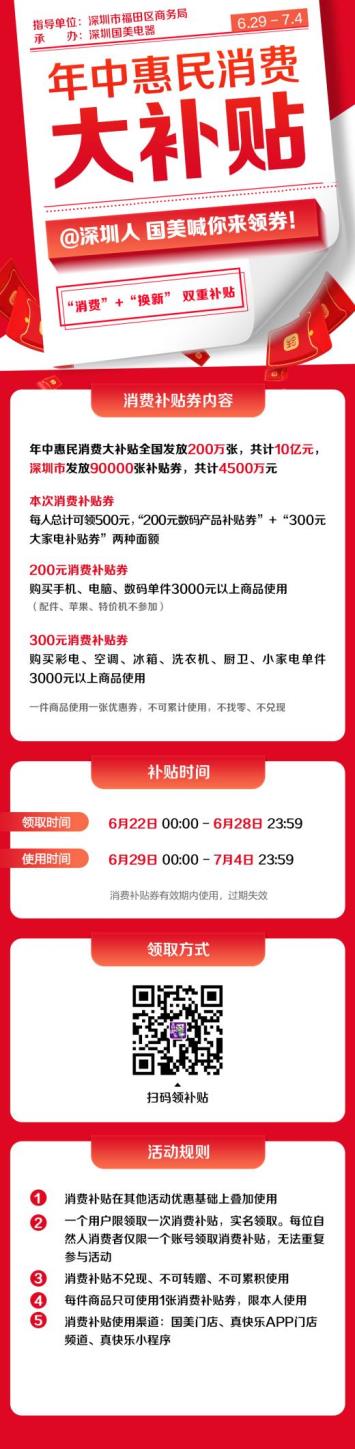據(jù)了解,本次活動(dòng)的發(fā)券時(shí)間為6月21日至6月28日,用券時(shí)間為6月29日至7月4日。全國消費(fèi)者只需登錄國美線上平臺(tái)“真快樂”,找到“門店”頻道(一店一頁),進(jìn)入“年中消費(fèi)惠民大補(bǔ)貼”活動(dòng)輪播頁面,點(diǎn)擊進(jìn)入活動(dòng)詳情頁即可領(lǐng)取補(bǔ)貼券。這次補(bǔ)貼將惠及全國總計(jì)約200萬人,數(shù)量有限,實(shí)名專享,廣大消費(fèi)者想要薅羊毛一定要趁早!