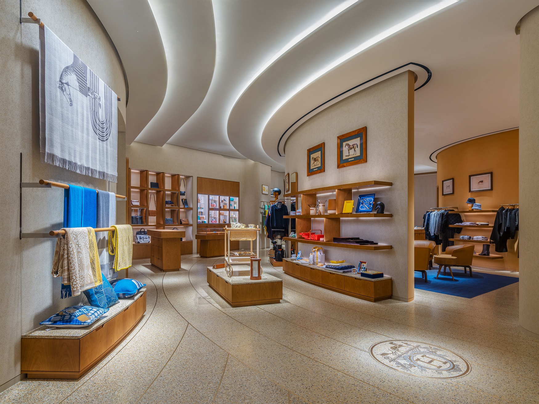 優(yōu)雅的專賣店空間由巴黎建筑事務(wù)所RDAI精心打造,并根植于品牌傳承精髓,將現(xiàn)代極簡主義風(fēng)格與源自本地的傳統(tǒng)工藝巧妙結(jié)合。賓客從正門步入店內(nèi),愛馬仕標(biāo)志性希臘式琉璃球頂燈的柔光傾瀉而下,與地面上黃銅裝飾的藏書章標(biāo)志遙相呼應(yīng),不同區(qū)域間流暢銜接,整體空間皆可被賓客盡收眼底。絲巾區(qū)域陳列著各式豐富色彩的印花絲巾;與之相鄰的美妝區(qū)域則歡迎賓客在此盡情體驗(yàn)RougeHermès唇妝系列。
