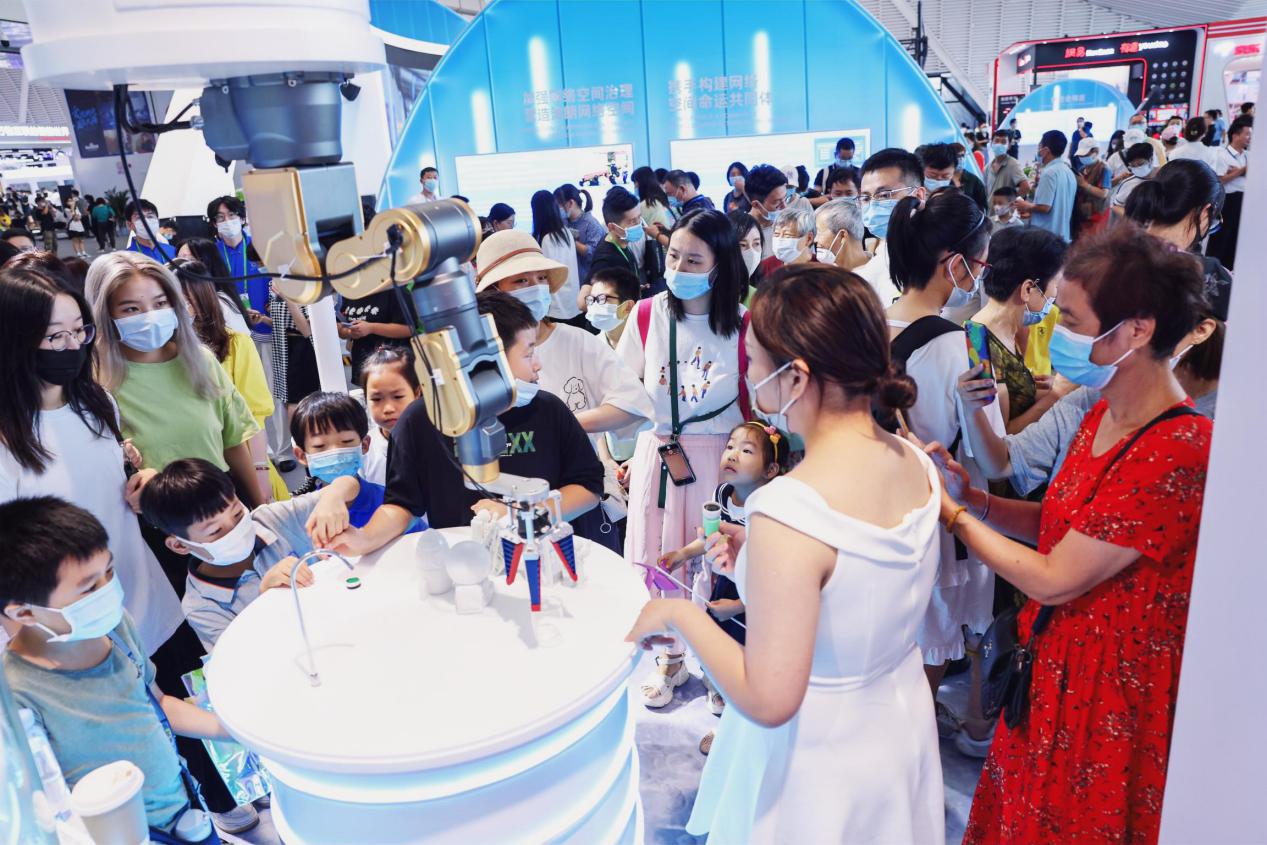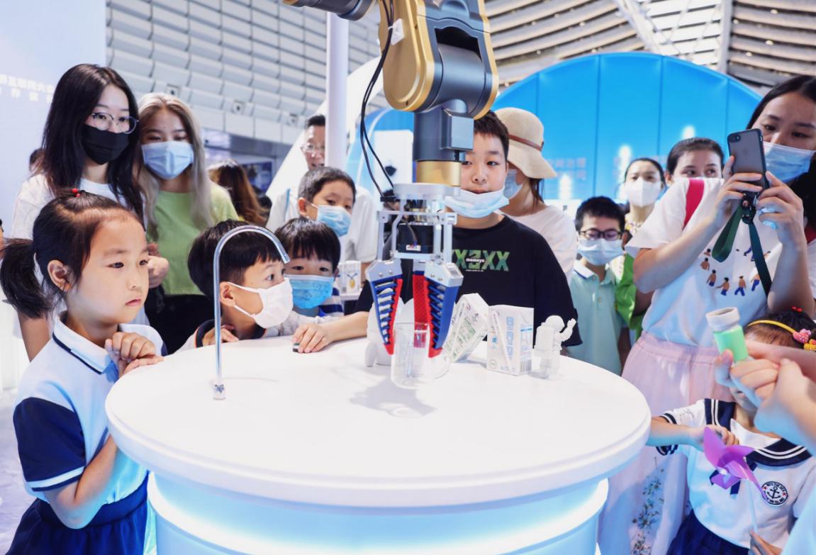 這牛奶和其他的不太一樣,很香濃。“離心精萃‘白科技’開啟臻濃新紀元”展臺一直就是博覽會現(xiàn)場的“人氣王”,這里以宇宙探索為主題,科幻感十足,火箭發(fā)動機噴出淡淡煙霧,三臺智能機械臂不停忙碌,人們排起長隊,品嘗由“離心精萃科技”現(xiàn)場調制的伊利臻濃牛奶。在這里,吸引觀眾的不僅是美味的伊利牛奶,也有滿滿的數(shù)字科技。