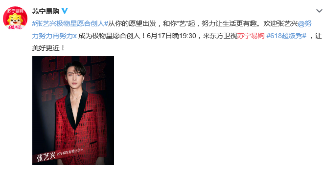 昨日,蘇寧易購(gòu)官宣張藝興作為合創(chuàng)人入職蘇寧易購(gòu)極物星愿事業(yè)群。據(jù)悉,蘇寧易購(gòu)還將響應(yīng)網(wǎng)友呼吁,簽下賈乃亮作為蘇寧直播聯(lián)合主理人入職。