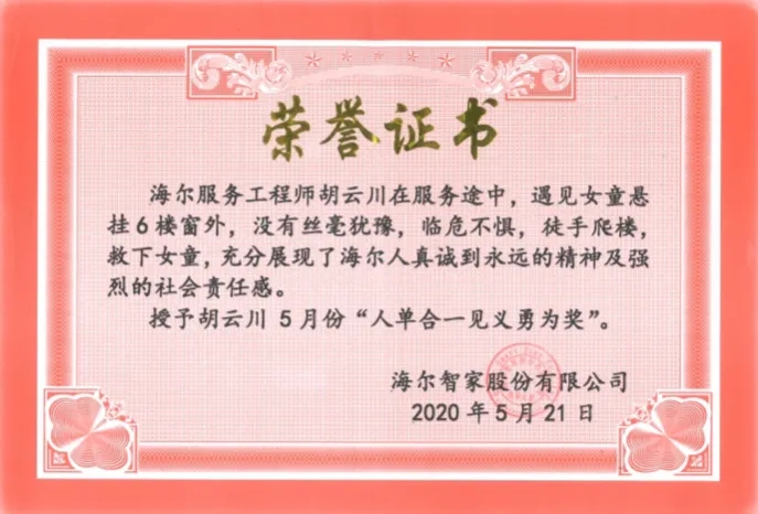近日,四川省富順縣海爾成套服務工程師胡云川徒手爬樓,救下懸在六樓窗戶外的女童。