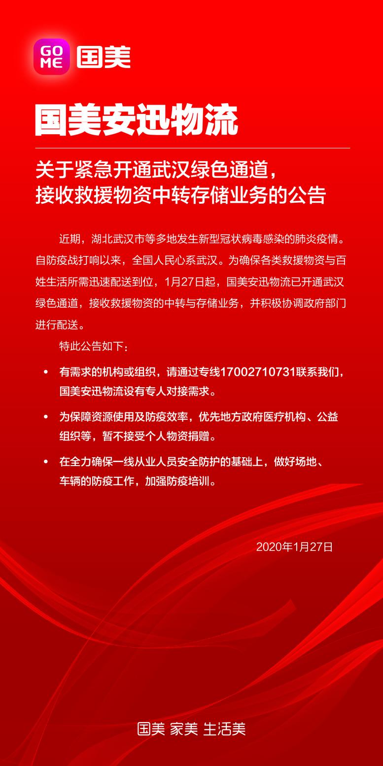 國(guó)美安迅物流宣布,即日起開(kāi)通武漢綠色通道,接收救援物資中轉(zhuǎn)與存儲(chǔ)業(yè)務(wù),并積極協(xié)調(diào)政府部門進(jìn)行配送,全力保障疫情防控物資運(yùn)輸。
