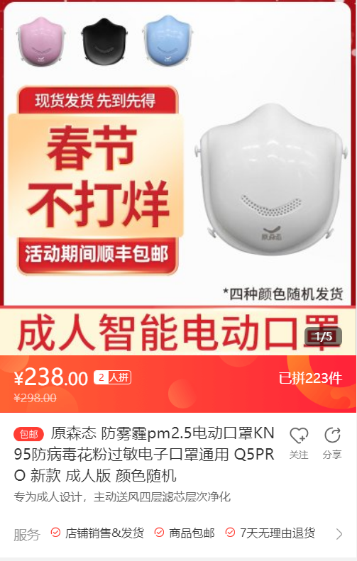 蘇寧拼購(gòu)積極聯(lián)系“拼工廠”復(fù)工,尋找源頭好貨。“原森態(tài)”KN95電動(dòng)口罩區(qū)別于市面上普通口罩,由博士專家團(tuán)隊(duì)打造,產(chǎn)品質(zhì)量符合歐盟、美國(guó)等出口國(guó)高標(biāo)準(zhǔn)。