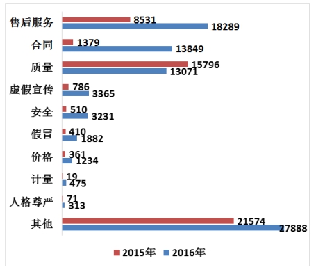由于投訴總量的激增,相對于2015年,除質(zhì)量問題之外,其他各類的投訴問題都增加,增加的幅度大多超過了1倍。如表3,圖4所示。
